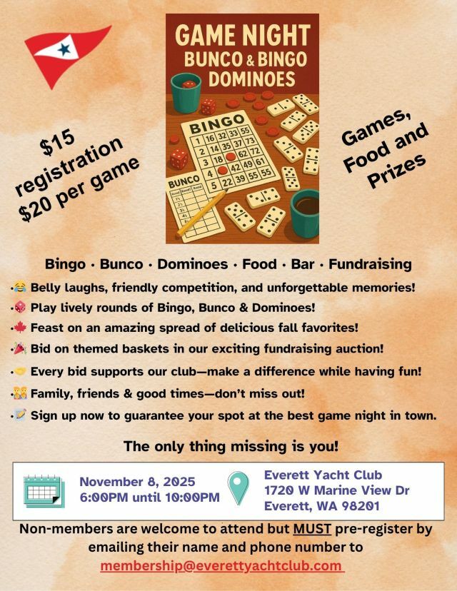 Be ready for an unforgettable evening of laughter, friendly competition, and lasting memories at Everett Yacht Club’s Fall Game Night! Enjoy spirited rounds of Bingo, Bunco, and Dominoes—see who emerges as the club’s champion on the high seas. Savor a delectable buffet of autumn-inspired dishes crafted to delight every palate. Take part in our lively fundraising auction featuring themed baskets, and support the club’s mission. Invite your crew—family, friends, and fellow members are all welcome for an evening of camaraderie and good times. Spaces are limited, so reserve your spot now for the most anticipated game night at the Yacht Club. The only thing missing is you!